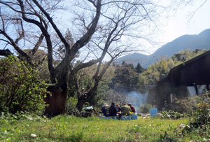 4月第一週末のきょう、恒例の花見をしました。 今年もまた鷽(ウソ)に花芽をついばまれて、かつてのような空が見えないほどの花はつきませんでしたが、 天気にも恵まれて30人ほどの友人たちとカッポ酒。 作品をみてもらったり、甘夏狩りを楽しんでもらったり、いい一日でした。