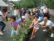 毎年8月15日、お隣の大入という地区の神社の参道で「大入盆綱引き」という行事があります。 山から採ってきた葛で編んだ30m強の綱を、青年と老壮年+子どもに分かれて三番勝負。 三番目の勝負がついたところで綱は断ち切られます。 勝った方の綱を浜に持って行き、その綱でつくった土俵で子ども相撲が行われますが、きょうは大潮満潮と重なり浜に下りれず、神社境内で行われました。